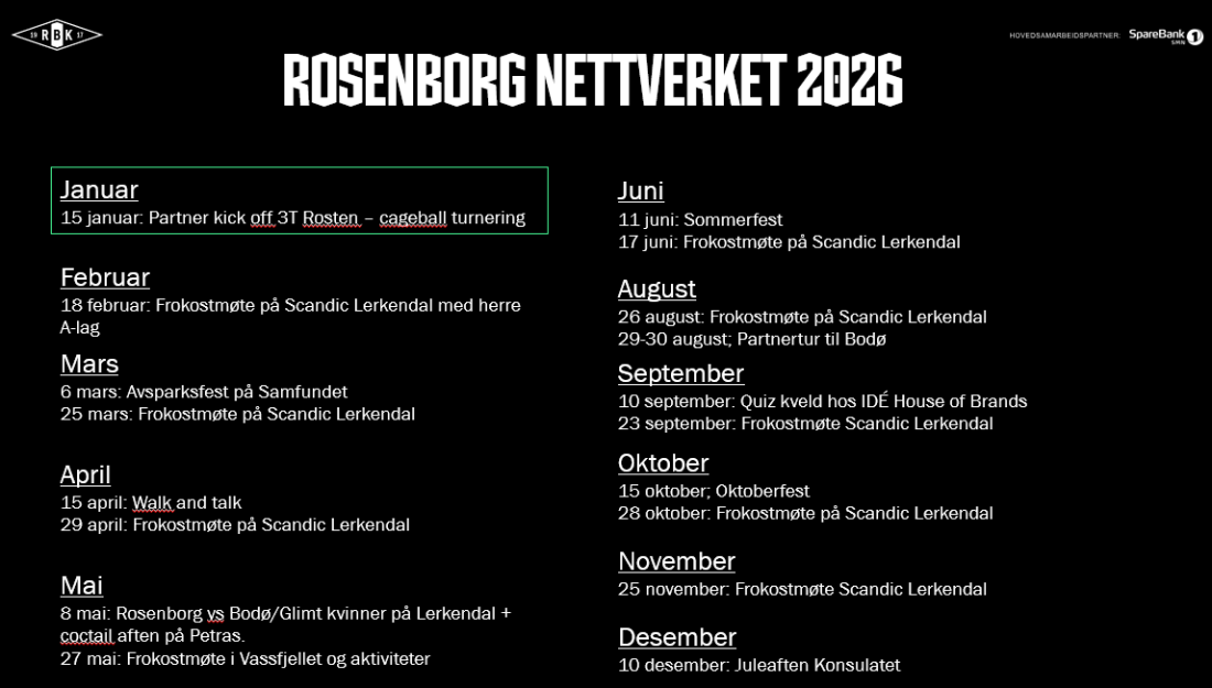Her er oversikten over alle partneraktiviteter i sesongen 2026. Vi gjør oppmerksom på at ingen egenandel tilkommer på våre arrangement. Alt inngår for 2 personer pr bedrift gjennom partneravtalen med klubben.