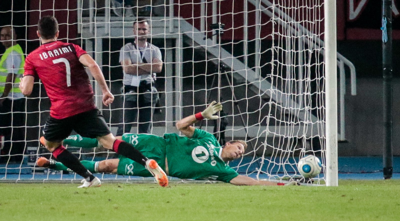 Veteranspissen Besart Ibraimi hadde bommet på sin forrige straffe i serien satte ballen hardt nede til venstre for André Hansen. Keeperen var kjapt nede og fikk noen fingre på ballen som snittet stolpen og gikk ut til corner.