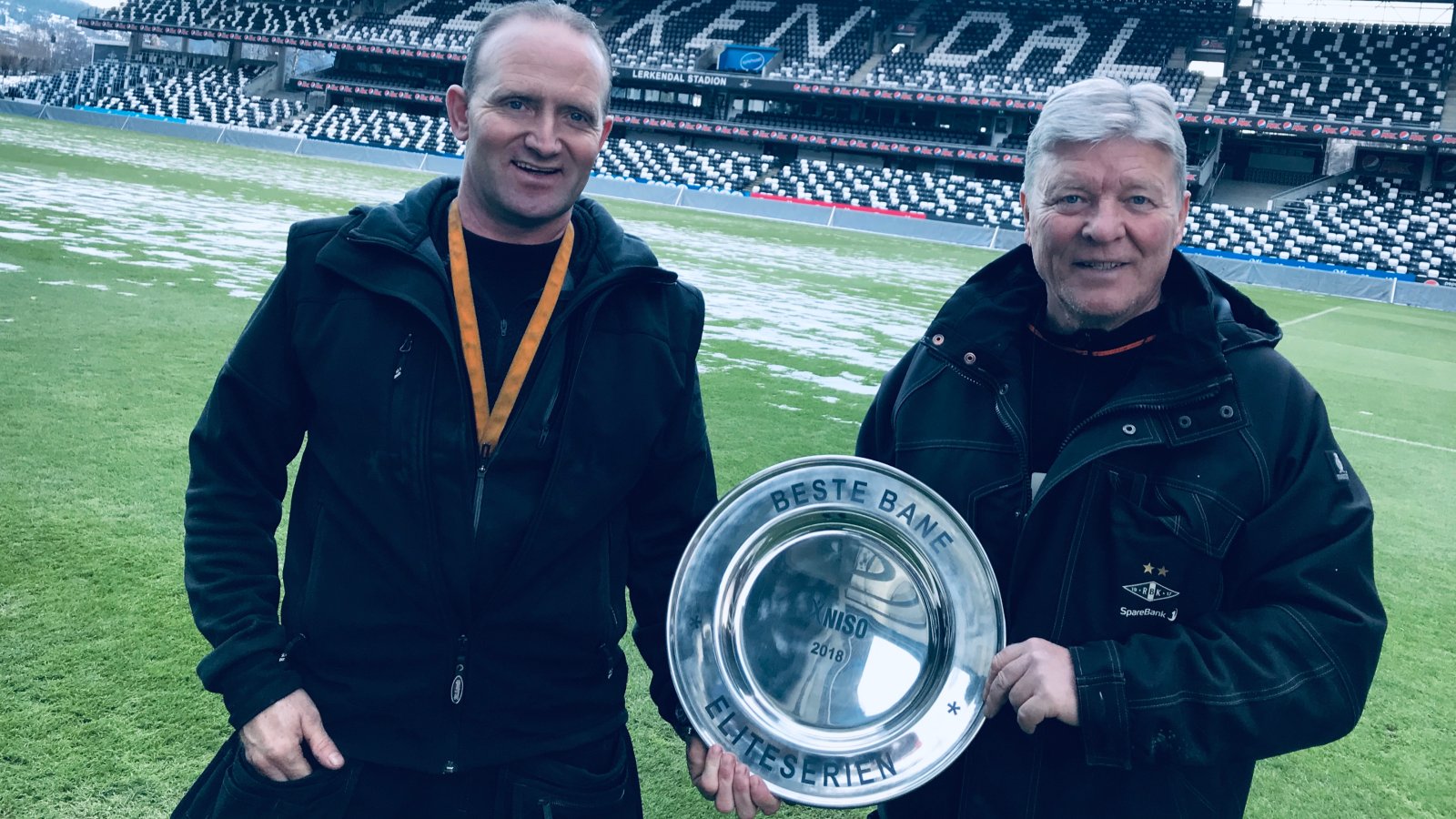 Teamet bestående av Anders Øyen (til venstre på bildet øverst), Trond Hansen (til høyre på bildet øverst), Martin Tinnen og Per Haugnes fikk publikums hyllest i pausen mellom Rosenborg og Celtic, da daglig leder Tove Moe Dyrhaug fikk æren av å dele ut NISOs gjeve banepris, som Lerkendal sist vant i 2013.