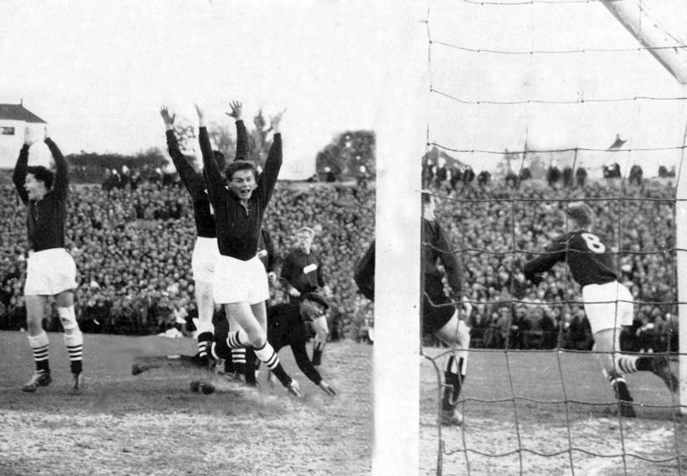 Cupfinalen 1960. Eldar Hansen har scoret. - Første seriemesterskapet