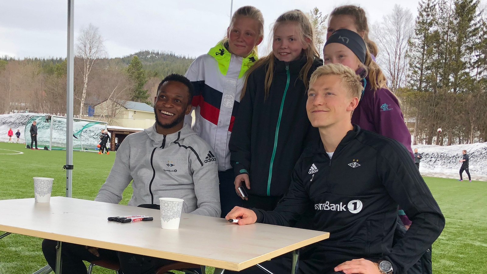 Nærmere 400 barn og voksne hadde møtt opp på idrettsplassen i Berkåk sentrum onsdag ettermiddag i forrige uke. Størst oppmerksomhet fikk naturlig nok RBK-spillerene Samuel Adegbenro og Birger Meling.