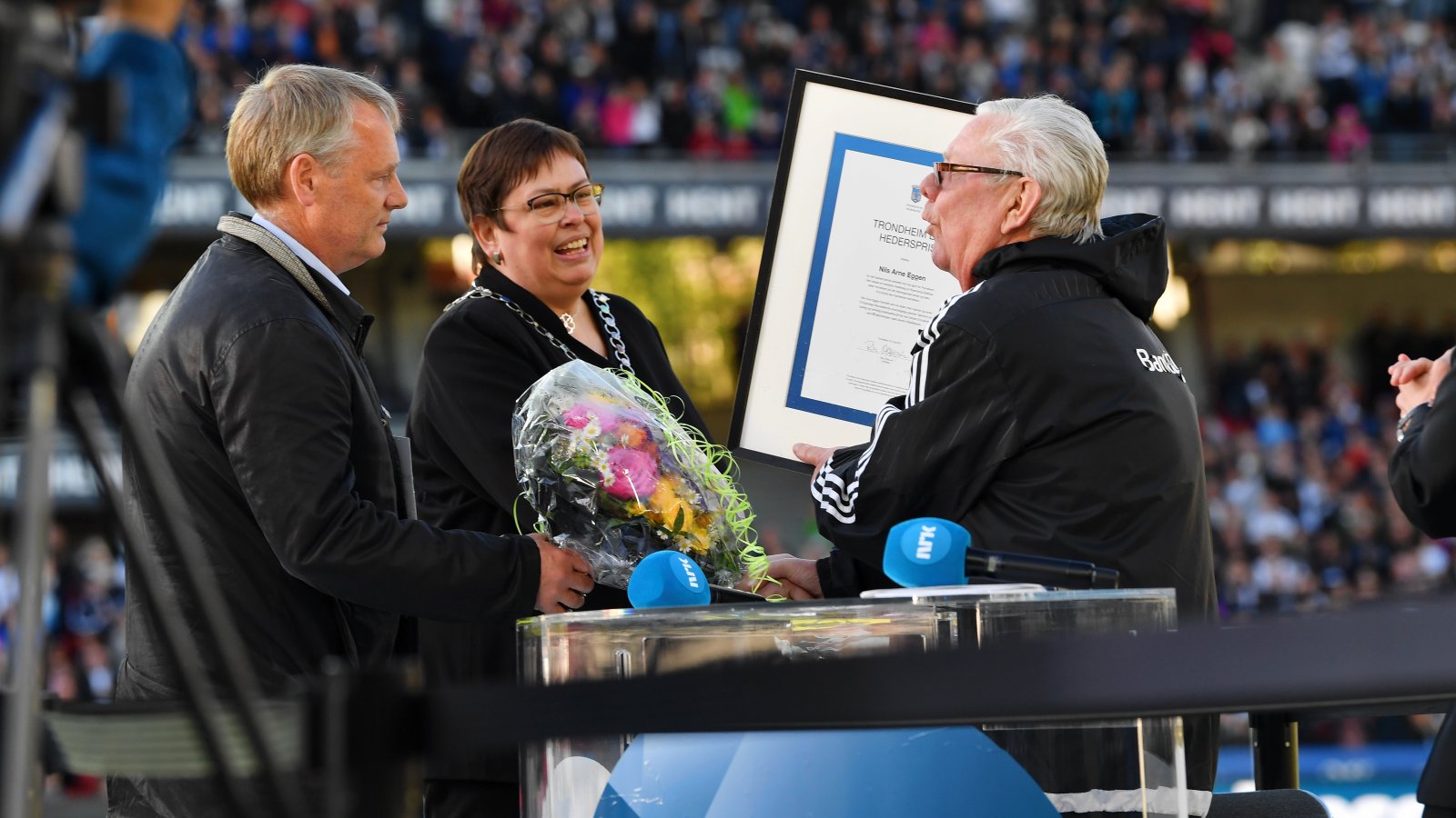 Trenerlegenden Nils Arne Eggen fikk tildelt Trondheim bys hederspris fredag kveld. Det skjedde på Lerkendal i forbindelse med feiringen av 100-årsjubileet til Rosenborg. Ordfører Rita Ottervik og rådmann Morten Wolden delte ut prisen.